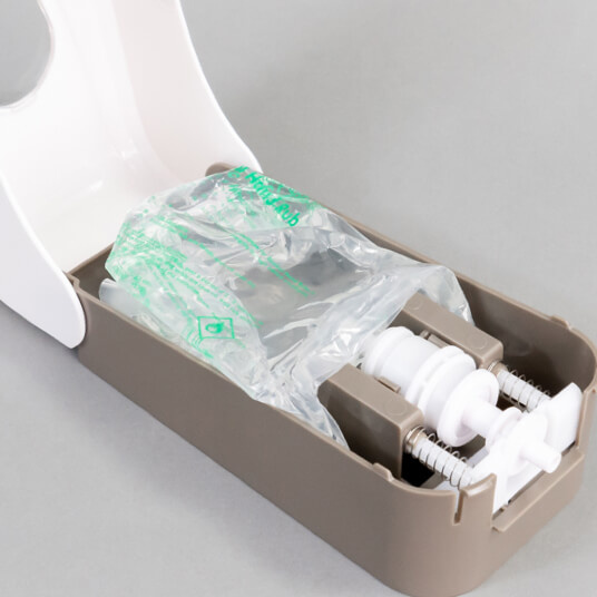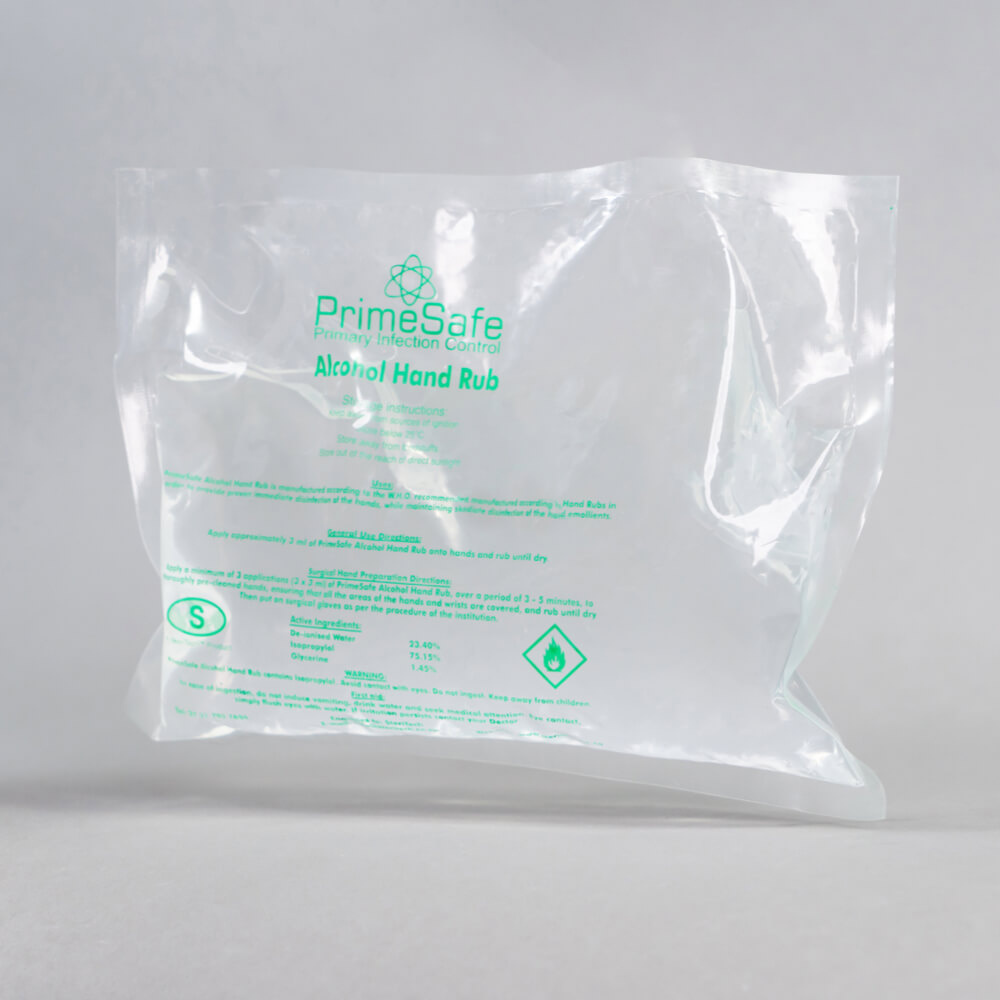 Dispensing sachet for hands-free or manual sanitiser, containing 80% ethanol-based hand sanitising liquid.