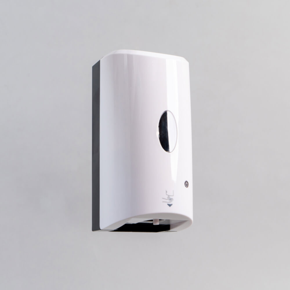 Touchless automatic dispenser accommodates one 800 ml liquid bag containing alcohol or soap solution. The dispenser can be wall-mounted or mounted to a utility pole..